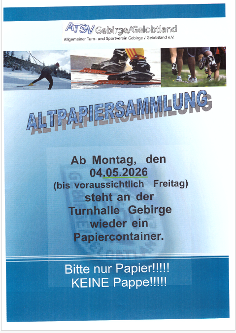 In der Woche ab dem 4. Mai steht an der Turnhalle in Gebirge ein Papiercontainer. Bitte sammelt fleißig (nur Papier, keine Pappe); der Erlös kommt unserem Nachwuchs zu Gute.