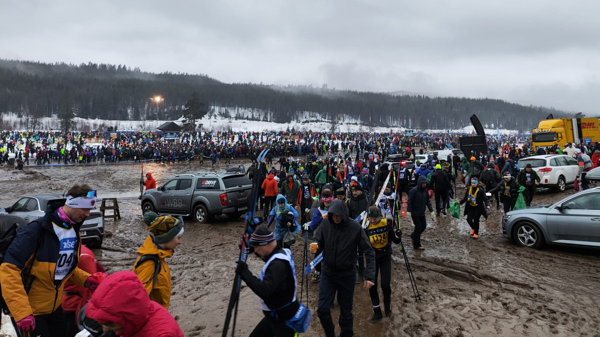 Sonntag, 3. März: Um 3:00 Uhr in der Früh klingelte für das Gros der ATSV-Teilnehmer der Wecker. Abfahrt 4:00 Uhr, Ankunft am Start 4:30 Uhr. Bereits eine bzw. eine halbe Stunde vor Öffnung der Startgruppen stellten sich die Läuferinnen und Läufer für einen Top-Platz an. Spätestens beim Anblick des schlammbedeckten Parkplatzes war klar, dass die Bedingungen wenn auch nicht jubiläumswürdig wie gewünscht, auf jeden Fall denkwürdig waren. Erschwerend kam aufgrund von Bauarbeiten ein kilometerlanger Stau für die Anfahrenden hinzu. Erwischt hatte dieser auch vier Sportler vom ATSV, die deshalb eine dreiviertel Stunde später starten mussten. So gingen also zunächst nur 17 Sportlerinnen und Sportler vom ATSV pünktlich um 8:00 Uhr gemeinsam mit über 15.000 anderen Skilangläufern auf die 90km-Reise. Wer wissen möchte, wie das so aussah, der kann sich unter Vasaloppet.tv die Aufnahmen vom Start und den unterschiedlichen Verpflegungsstationen anschauen.