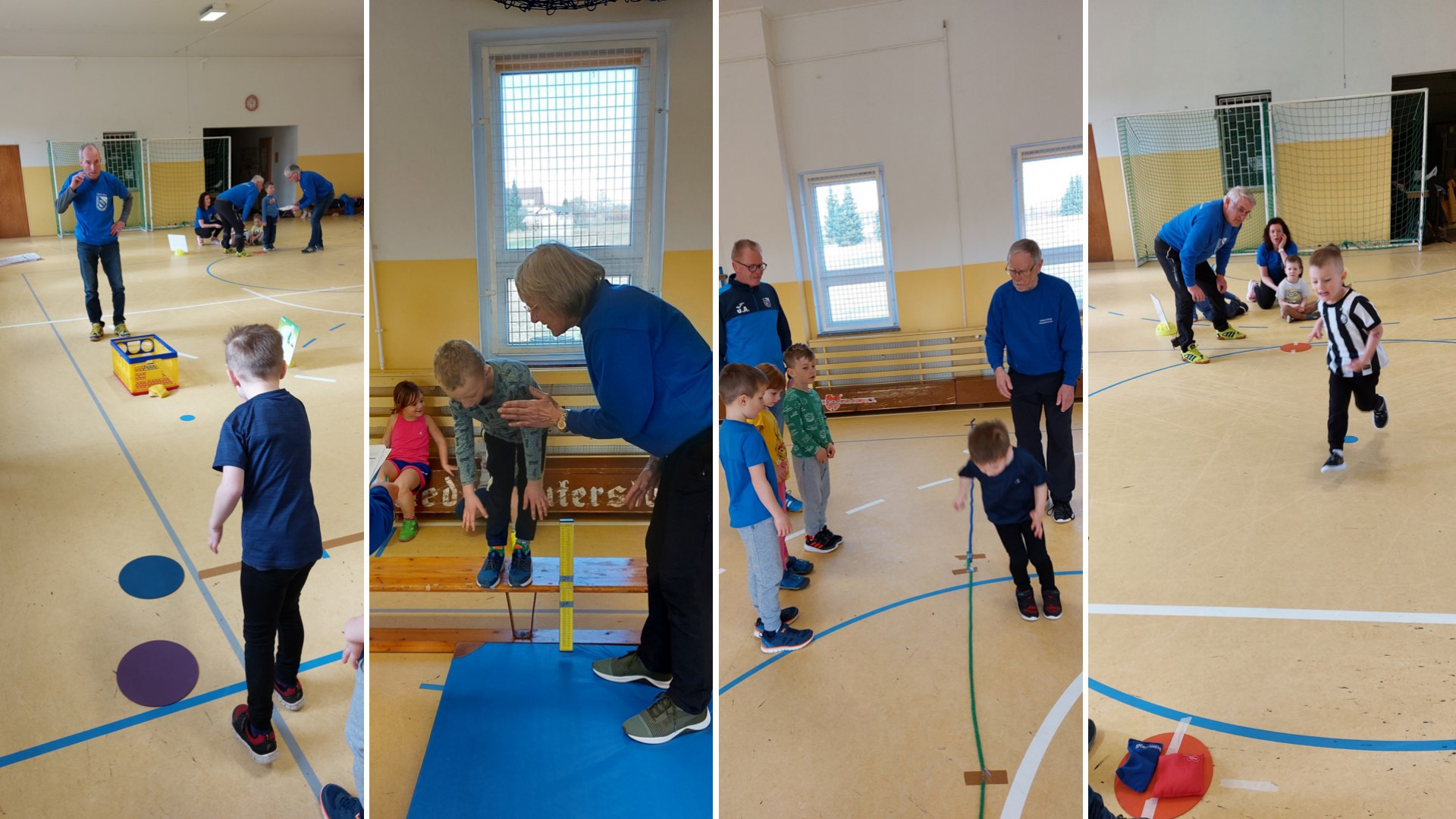 9:00 Uhr war es soweit. 15 aufgeregte Kinder betraten mit den Erzieherinnen Frau Börner, Frau Müller sowie einer Auszubildenden die Turnhalle. Nach einer Begrüßung und Eröffnung durch Bernd Helmert vom ATSV und einer anschließenden Erwärmung, konnten die Kinder an sieben Stationen ihr Können unter Beweis stellen. Mit viel Freude und Begeisterung gingen die Jungen und Mädchen an die Erfüllung ihrer Aufgaben.