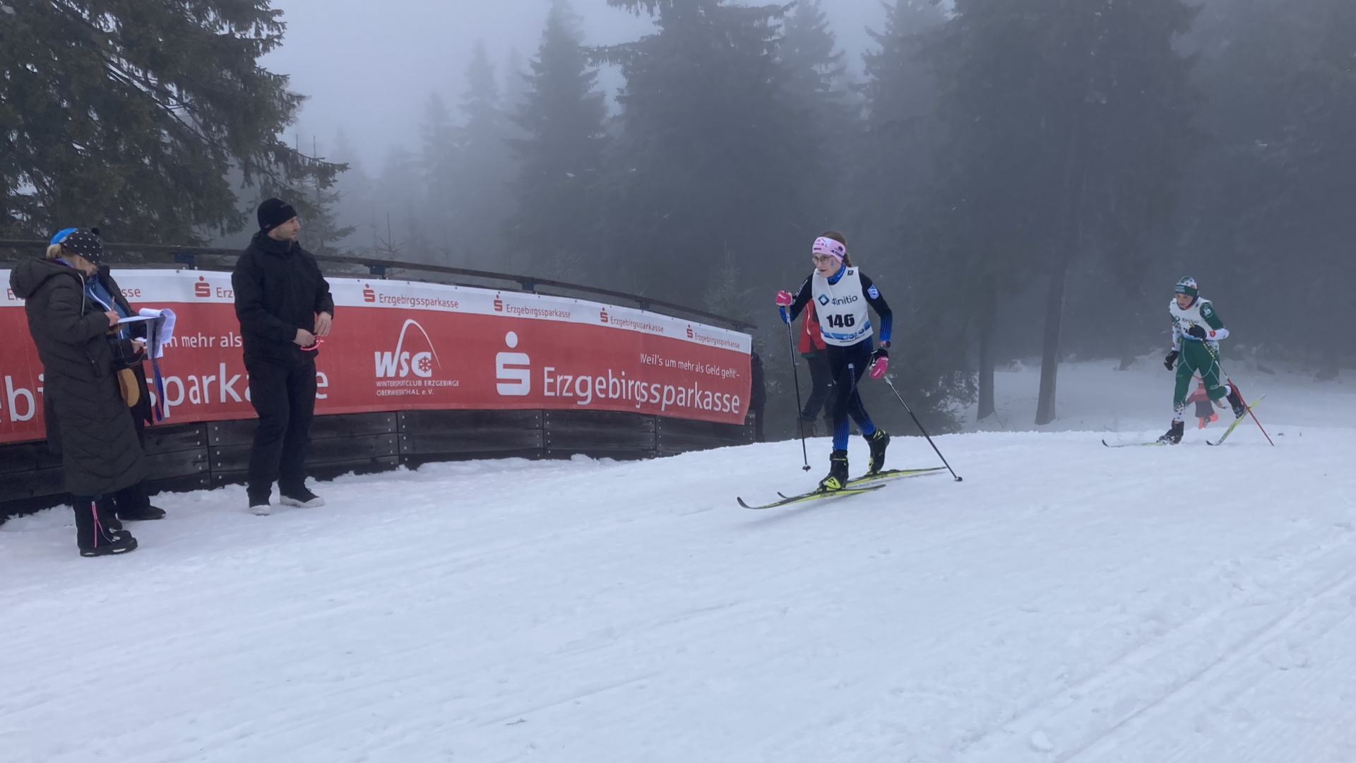 Am Sonntag galt es im Massenstart über längere Distanzen das umfangreiche Training der vergangenen Monate in die Loipe zu bringen. Souverän gelang das Lea Schmieder und Elina Reichel, die das „Doppel“ perfekt machten und sich mit einer zweiten Goldmedaille belohnten. In 16:45 min auf 5 km gewann Lea mit einem Vorsprung von 35 Sekunden vor Emma Kiesling vom VSC Klingenthal und Maxine Escher vom SSV Geyer. Elina hängte ihre Sportskollegin und -konkurrentin Frida Dost vom SV Neudorf in der Loipe über 3,7 km mit 25 Sekunden erneut ab. Zum doppelten Vizesachsenmeistertitel fuhr auch Lara Rudolph in der U13.
